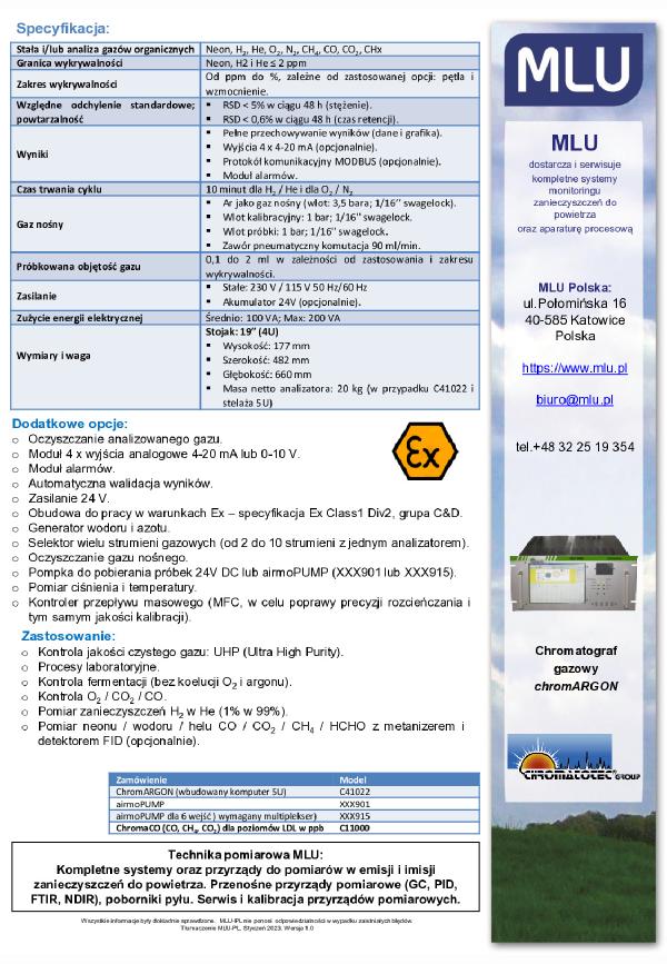 ChromARGON to automatyczny, przemysłowy lub laboratoryjny analizator gazowy. Temperatura pracy ustawiana jest izotermicznie. Próbka przechodzi przez pętlę do pobierania próbek i następnie jest wstrzykiwana do kolumny analitycznej, w celu separacji. Istnieje możliwość zastosowania kolumny z konkretnym wypełnieniem. Po wykonaniu separacji, ilość każdego związku jest mierzona za pomocą uniwersalnego detektora termokonduktometrycznego - katarometru. Piec umożliwia regenerację kolumny w temperaturze 250°C.