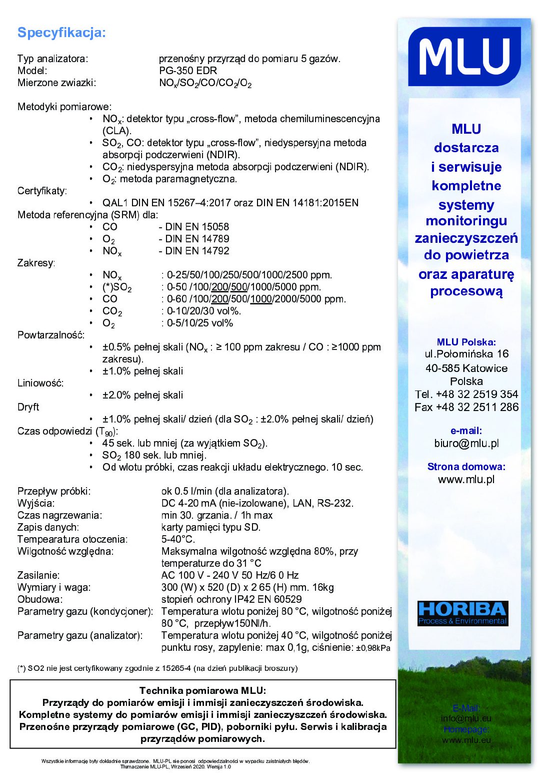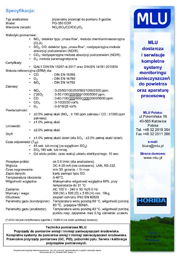 Nowe mobilne możliwości analizy gazu o wysokiej precyzji. System pomiarowy Horiba PG350P-AMS zgodny z normą 15267-4 składa się z następujących elementów: Analizator Horiba PG 350 EU, kondycjoner gazu PSS-5H, sondy poboru próby (PSP-4000H) oraz grzanego węża o długości 5m. Komplet spełnia wymagania normy EN 15267-1, 2, 4 dla pomiarów okresowych stacjonarnych źródeł energii. Analizator PG350 EU jest dwuzakresową wersją przyrządu z obudową o stopniu ochrony IP42. Analizator ma zatwierdzenie typu metodyk pomiarowych O2, NOx oraz CO.