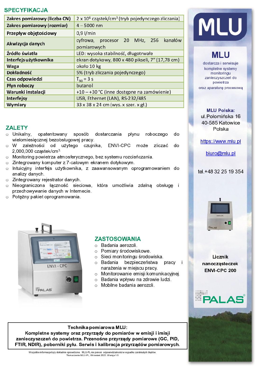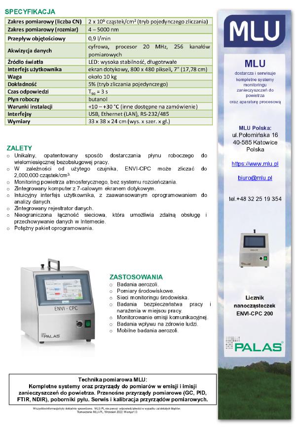 Kondensacyjny licznik nanocząsteczek Palas® ENVI-CPC 200, to przyrząd CPC służący do monitorowania otaczającego powietrza. Model 200, jest odpowiedni do wykonywania pomiarów w środowisku wysokich stężeń i umożliwia zliczanie pojedynczych cząstek do 2,000,000 cząstek/cm3. Może być on używany do monitoringu otaczającego powietrza, bez konieczności rozcieńczania.