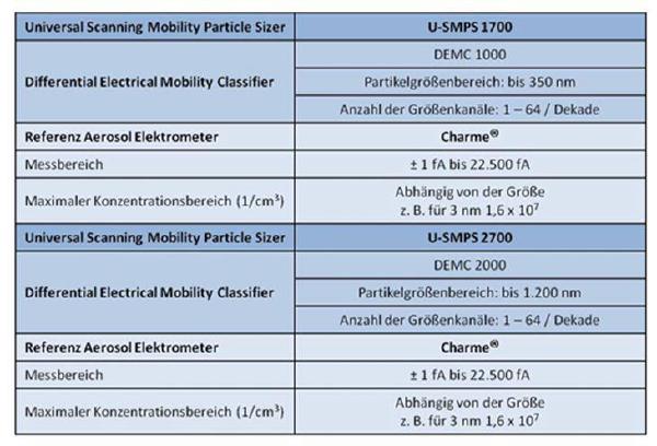Uniwersalny licznik nanocząstek Palas® (U-SMPS) jest dostępny w dwóch wersjach. Z krótką kolumną klasyfikatora (model 1700), U-SMPS nadaje się do pomiarów rozkładów wielkości cząstek w zakresie od 2 do 400 nm.