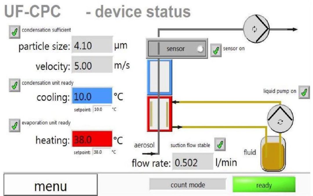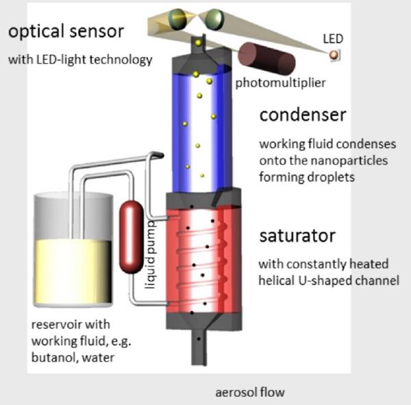 Rysunek poniżej przedstawia zasadę działania licznika UF-CPC. Aerozol z nanocząsteczkami jest pobierany do dolnej części przyrządu UF-CPC, po czym jest kierowany do ogrzanej komory parowania - saturatora. W saturatorze płyn roboczy porusza się spiralnie wokół obszaru przepływu aerozolu. W ten sposób powstaje bardziej jednorodna powierzchnia styku, w porównaniu do konstrukcji, w których tylko jedna lub dwie ściany saturatora są wyłożone porowatym materiałem, nasączonym płynem roboczym. Ponadto, płyn krąży w sposób ciągły, przechodząc ze zbiornika do stale podgrzewanej spirali i kanału w kształcie litery U.