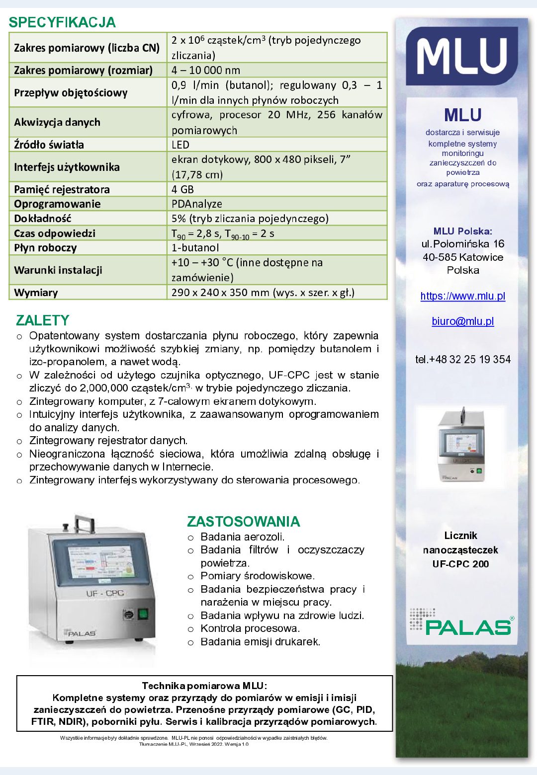 Kondensacyjny licznik nanocząsteczek Palas® UF-CPC 200, to przyrząd CPC służący do wykonywania pomiarów w środowisku, w trybie pojedynczego zliczania, w zakresie do 2,000,000 cząsteczek/cm3.