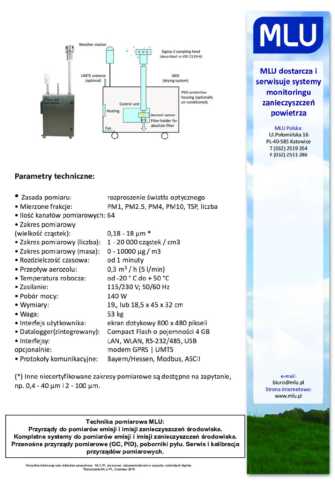 System ciągłego monitorowania jakości powietrza Fidas® zapewnia ciągłe i równoczesne pomiary PM1, PM2.5, PM4, PM10, TSP (PMtot) oraz pomiar liczby cząstek. Wszystkie przyrządy Fidas® wykorzystują zatwierdzoną technologię pomiaru: optycznego rozproszenia światła i są wyposażone w źródło światła LED o stabilnej wydajności i długiej żywotności. Przyrządy te zawierają uchwyt filtra dla filtra pyłowego (ø 47 lub 50 mm). Tak więc możliwa jest także analiza chemiczna kompozycji aerozolu. Modele Fidas® 200 i Fidas® 200S działają z przepływem aerozolu 4,8 l/min i są wyposażone w głowicę pomiarową Sigma-2 zgodnie z VDI 2119-4, co pozwala na reprezentatywny pomiar nawet przy silnym wietrze. Ponadto oba modele wyposażone są w inteligentny system suszenia aerozoli (IADS) oraz czujnik do pomiaru temperatury otoczenia, ciśnienia powietrza i wilgotności względnej. IADS zapobiega błędnej klasyfikacji cząstek z powodu wilgoci. Modułowa konstrukcja systemu Fidas® ułatwia montaż w istniejących szafach 19". Dzięki elastycznemu systemowi instalacji modułu czujnika pomiarowego możliwe jest wykorzystanie istniejących przepustów dachowych. Poza optycznym pomiarem online z dużą rozdzielczością czasową, analizatory Fidas® mogą być wyposażone w standardową głowicę pomiarową dla PM2.5 lub PM10 (Leckel PMXPNK). Dzięki ważeniu filtra dane pomiarowe mogą być sprawdzone na miejscu w sposób grawimetryczny. Fidas® 210 jest dodatkowo wyposażony w stację pogodową do pomiaru kierunku i prędkości wiatru oraz ilość i rodzaj opadów.