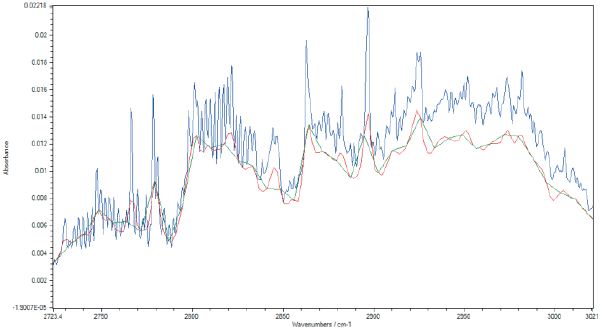 AtmosFIR to analizator FTIR o wysokiej rozdzielczości. Działa on standardowo w rozdzielczości do 0,7 cm-1, natomiast rozdzielczość 0,5 cm-1 jest dostępna opcjonalnie. W porównaniu do technik o niższej rozdzielczości, oznacza to, że piki absorpcji generowane przez HCHO, mogą być precyzyjnie identyfikowane, z większą intensywnością niż przy niższej rozdzielczości, a to z kolei powoduje obniżenie granic wykrywalności dla HCHO. Rysunek poniżej przedstawia porównanie widm HCHO w różnych rozdzielczościach. Nawet w przypadku wzajemnej ingerencji innych gazów, granica wykrywalności HCHO będzie wystarczająco niska, żeby spełnić wymogi sprawozdawczości legislacyjnej.
