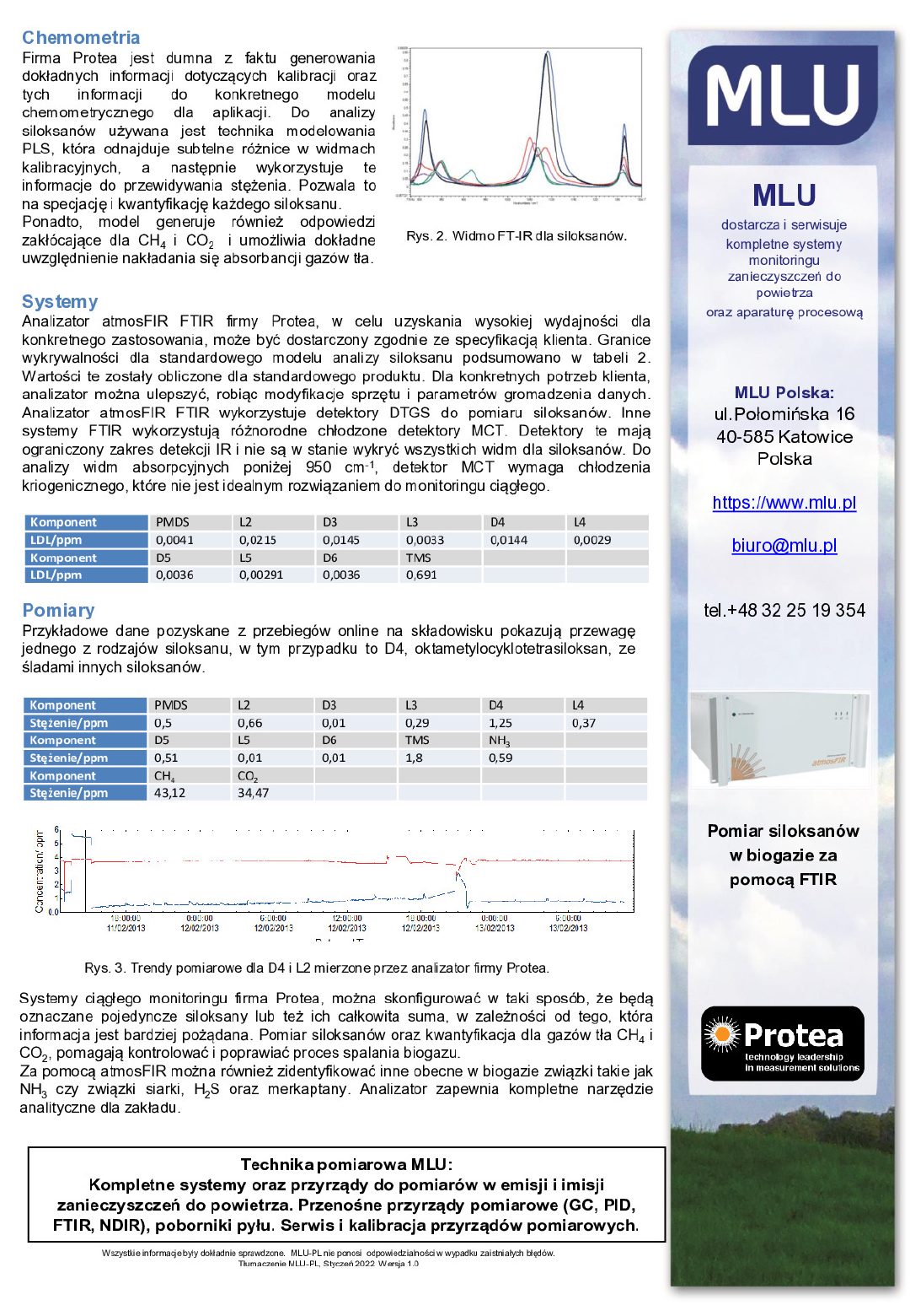 Firma Protea opracowała model analityczny, umożliwiający specjację siloksanów w trybie on-line. Technika pełnego spektrum FTIR pozwala na pomiar głównych komponentów gazowych oraz CH4, CO2, NH3 itp. Gazy składowiskowe zawierają szereg popularnych siloksanów oraz innych związków, które zamieszczono w poniższej tabeli. Skład biogazu będzie różny dla każdego ze składowisk odpadów czy innych źródeł. Firma Protea opracowała listę, zawierającą większość występujących w biogazach prostych i cyklicznych związków siloksanowych. Trimetylosilanol, chociaż nie jest siloksanem, może prowadzić do tworzenia siloksanów i jako taki związek został uwzględniony w modelu analitycznym.