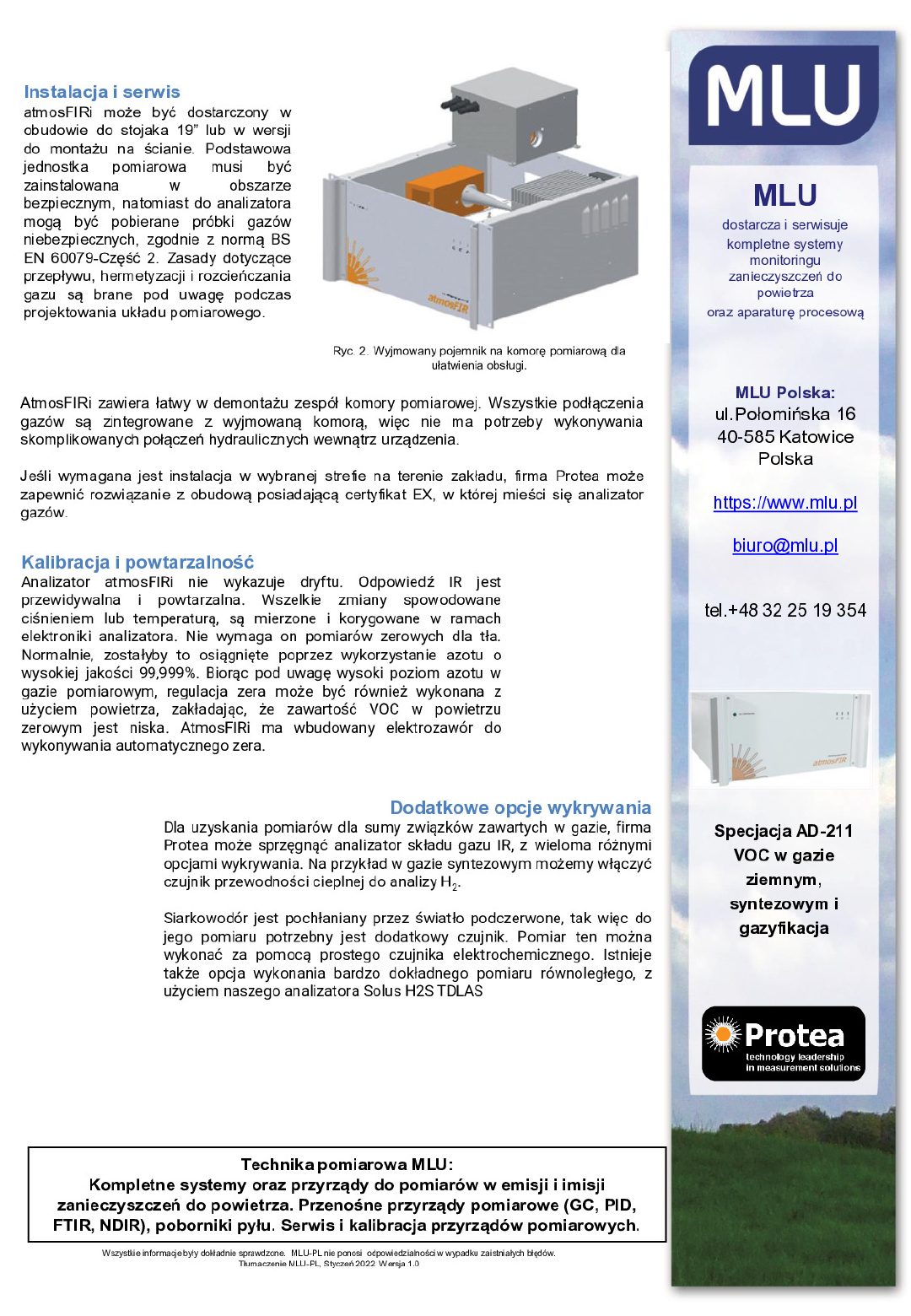 Analizator atmosFIRi to analizator wykorzystujący transformację Fouriera w podczerwieni (FTIR), z jednoprzebiegową komorą pomiarową, z bardzo małym przepływem i wysoką przepustowością. W komorze pomiarowej nie ma kosztownej optyki pokrytej złotem, ponieważ nie jest wymagana długa ścieżka pomiarowa. Celem analizatora jest uzyskanie szybkiej odpowiedzi na % poziomy stężeń poszczególnych VOC, obecnych w składzie gazu ziemnego, biogazu i gazu syntezowego. AtmosFIRi wykonuje pomiary w wysokie rozdzielczości, łącząc w sobie moc analityki laboratoryjnej z solidnym, stabilnym i łatwym w utrzymaniu analizatorem procesowym. Wysoka rozdzielczość umożliwia wykrycie i określenie ilościowe, wielu nakładających się na siebie widm dla związków VOC.