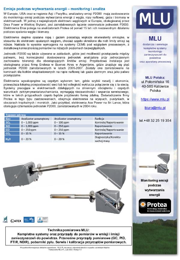 W Europie, USA oraz w regionie Azji i Pacyfiku, analizatory emisji P2000 mają zastosowanie do monitoringu emisji podczas wytwarzania energii z węgla, ropy naftowej, gazu i biomasy w elektrowniach. W jednej z największych elektrowni węglowych w Europie, obsługiwanej przez Drax Power w Wielkiej Brytanii, jest zainstalowanych łącznie osiemnaście jednostek P2000. Elektrownia Drax polega na analizatorach Protea od ponad 15 lat i ich niezawodnym działaniu podczas spalania węgla i biomasy.