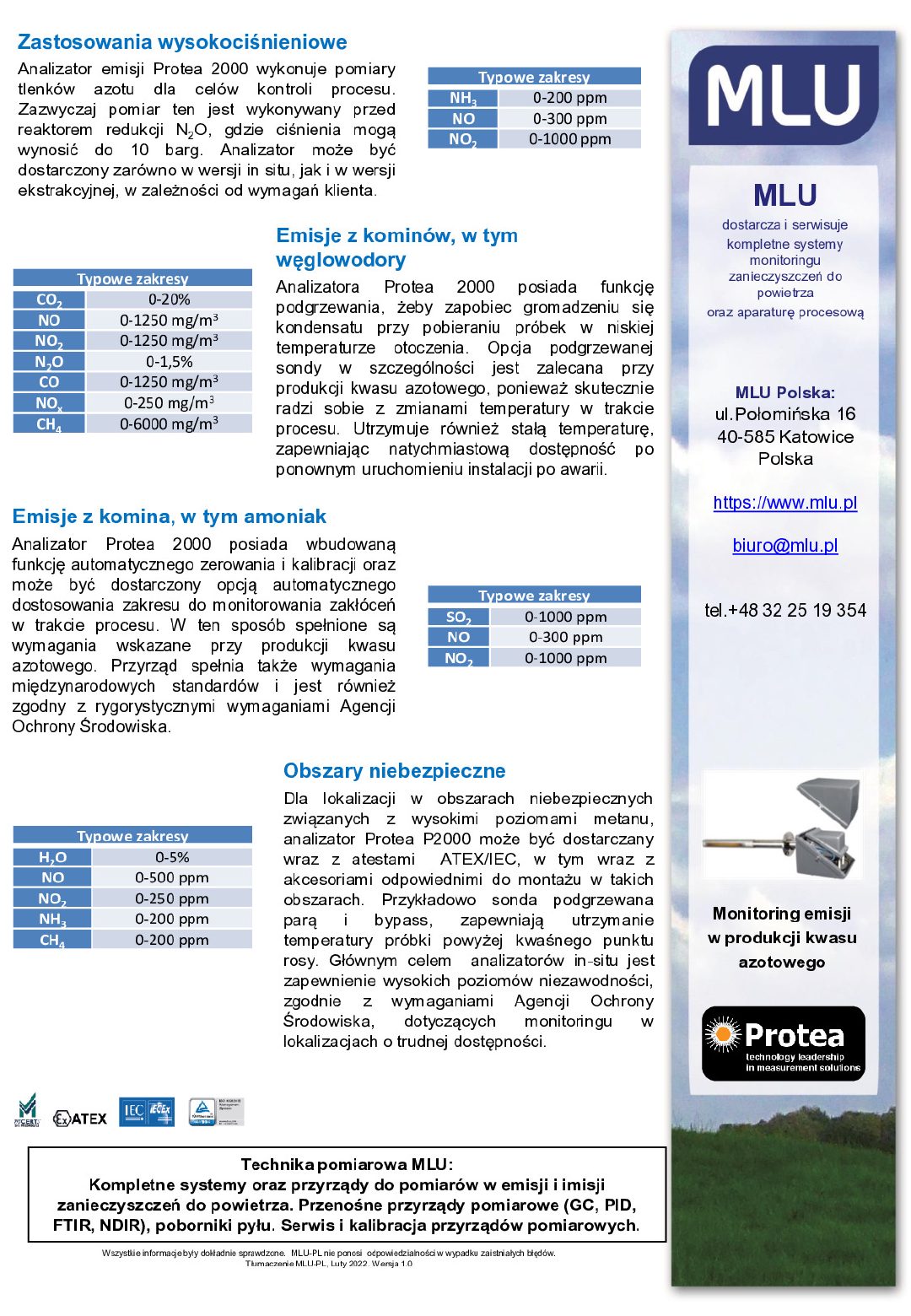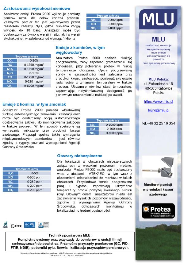 Analizator emisji Protea 2000 wykonuje pomiary tlenków azotu dla celów kontroli procesu. Zazwyczaj pomiar ten jest wykonywany przed reaktorem redukcji N2O, gdzie ciśnienia mogą wynosić do 10 barg. Analizator może być dostarczony zarówno w wersji in situ, jak i w wersji ekstrakcyjnej, w zależności od wymagań klienta.