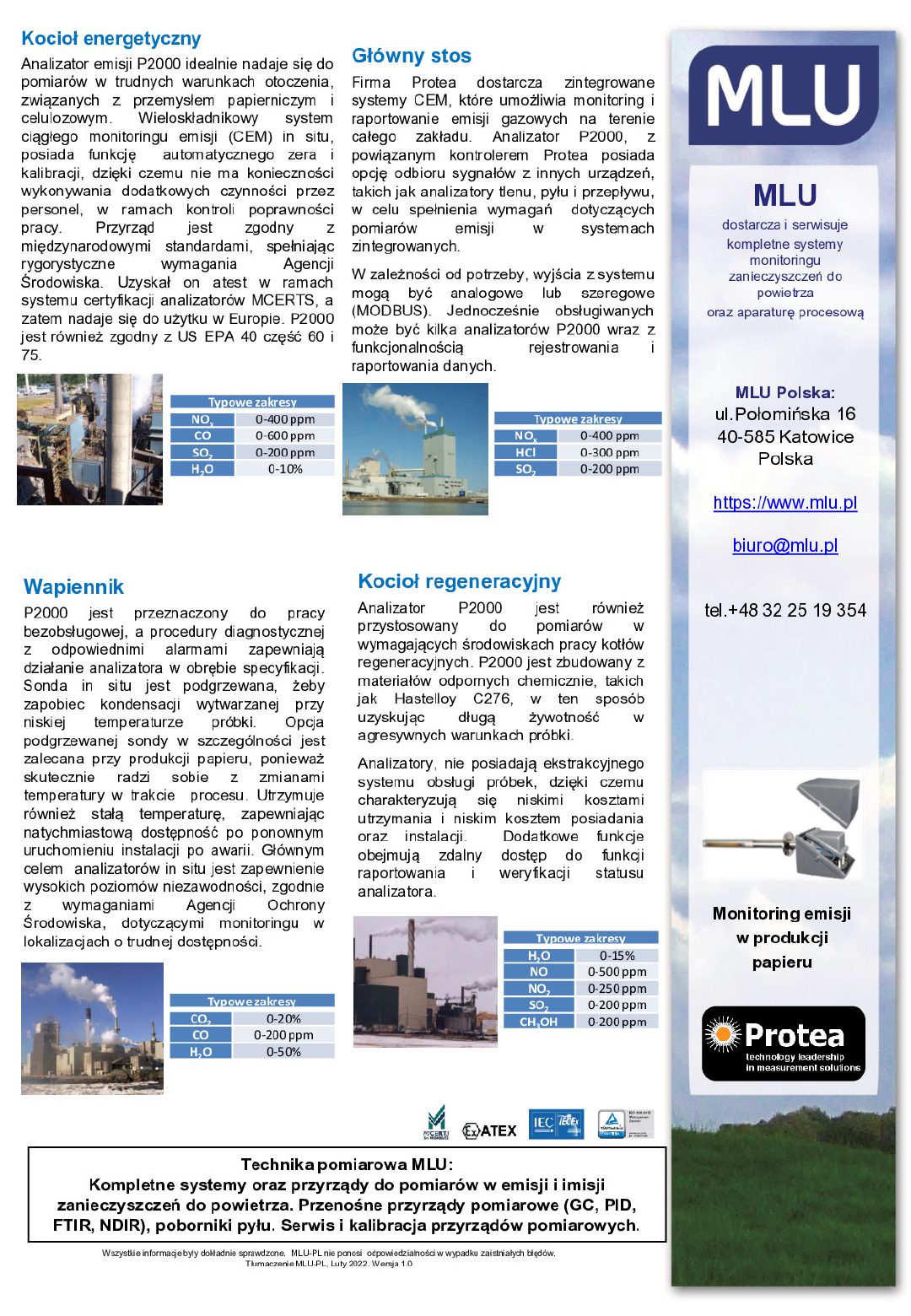 Analizator emisji P2000 idealnie nadaje się do pomiarów w trudnych warunkach otoczenia, związanych z przemysłem papierniczym i celulozowym. Wieloskładnikowy system ciągłego monitoringu emisji (CEM) in situ, posiada funkcję automatycznego zera i kalibracji, dzięki czemu nie ma konieczności wykonywania dodatkowych czynności przez personel, w ramach kontroli poprawności pracy. Przyrząd jest zgodny z międzynarodowymi standardami, spełniając rygorystyczne wymagania Agencji Środowiska. Uzyskał on atest w ramach systemu certyfikacji analizatorów MCERTS, a zatem nadaje się do użytku w Europie. P2000 jest również zgodny z US EPA 40 część 60 i 75.