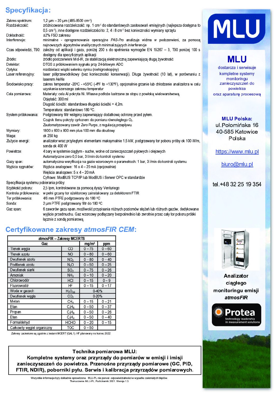 atmosFIR CEM to kompletny system ciągłego monitoringu emisji (CEMS) z wbudowanym analizatorem FITR montowanym w stojaku. Sercem systemu jest solidny i sprawdzony spektrofotometr FTIR o wysokiej rozdzielczości, oferujący olbrzymią przepustowość sygnału, niski poziom szumu, żywotność komponentów i dużą dokładność pomiarową. Analizator FITR zawiera wbudowany system próbkowania i jest zaprojektowany dla monitorowanie emisji na poziomie ppm.