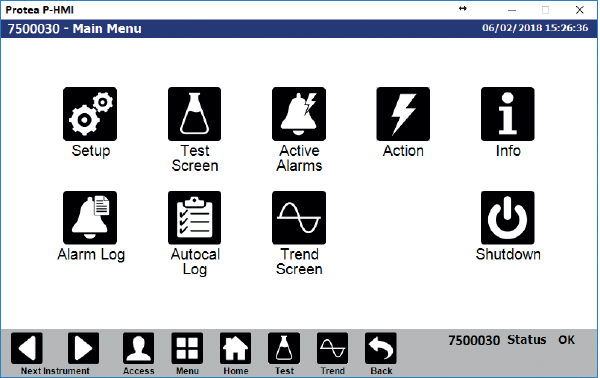 Z ekranu głównego można uzyskać dostęp do różnych ekranów specyficznych dla analizatorów lub systemu, za pomocą „miękkich” przycisków wielofunkcyjnych na ekranie dotykowym. Obejmują one m.in. następujące ekrany: