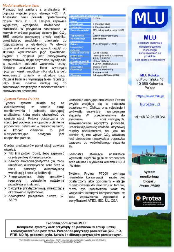 Protea P7000 to wielogazowy analizator biogazu, przeznaczony do ciągłego monitoringu gazu procesowego ze składowisk, biogazu i gazu ziemnego. System monitorowania jest przeznaczony do umieszczania w obszarach niebezpiecznych. Ma on konstrukcję modułową i konfiguracja będzie zależeć od zastosowania, a tym samym gazów, które mają być monitorowane.