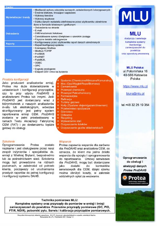 Ciągła rejestracja, raportowanie i analiza danych emisyjnych, jest niezbędna operatorom instalacji, do oceny zgodności z wymaganiami środowiskowymi. Oprogramowanie ProDAHS, jako pełna platforma raportowania emisji, może być dostarczona i skonfigurowana, do użytku z urządzeniami emisyjnymi Protea lub innych producentów.