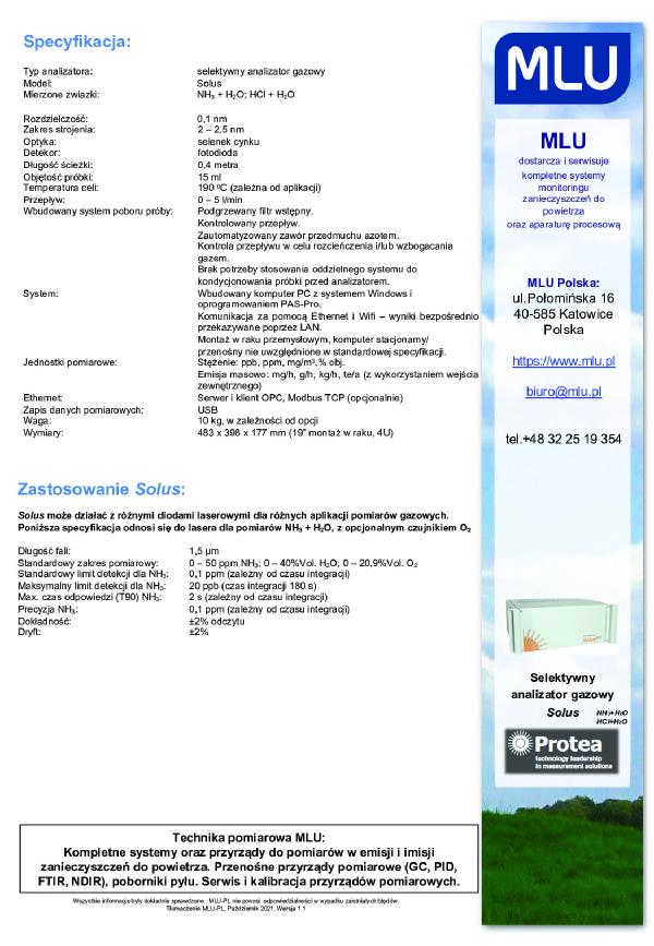 Solus jest analizatorem gazowym produkowanym przez firmę Protea, zaprojektowanym do selektywnych i precyzyjnych pomiarów gazów jedno lub dwuskładnikowych. Solus łączy najnowszą spektroskopię diod laserowych TDL (strojeniowa dioda laserowa) wraz z najlepszymi technologiami mikro mechanicznymi, w celu uzyskania precyzyjnie kontrolowanej długości fali, którą można dostroić w wąskim zakresie. Wąski zakres umożliwia wybór dokładnego spektrum absorbancji w rejonie NIR, bez wzajemnych interferencji innych gazów absorbujących. Analizator pozwala na szybkie i wysoce selektywne pomiary gazów jedno- lub dwuskładnikowych. Pomiary gazów jedno- lub dwuskładnikowych, za pomocą technologii absorbancji, z użyciem strojeniowego lasera diodowego.