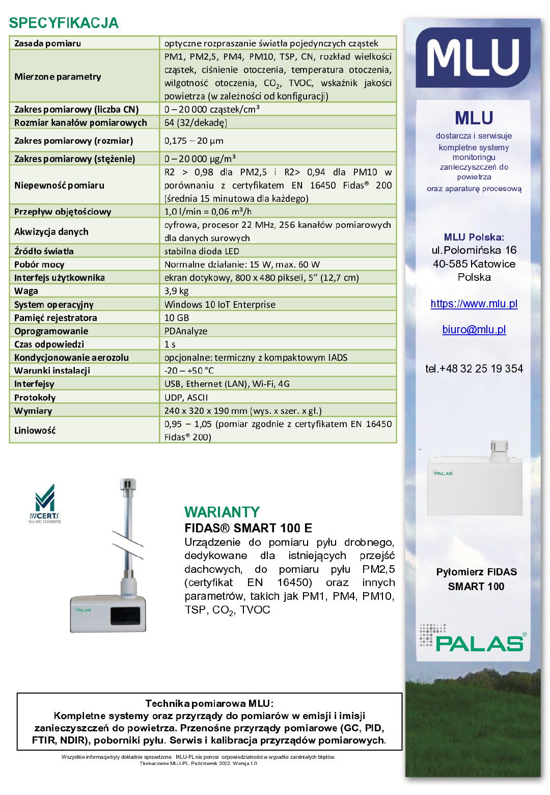 | Niepewność pomiaru | R2 > 0,98 dla PM2,5 i R2> 0,94 dla PM10 w porównaniu z certyfikatem EN 16450 Fidas® 200 (średnia 15 minutowa dla każdego) |
