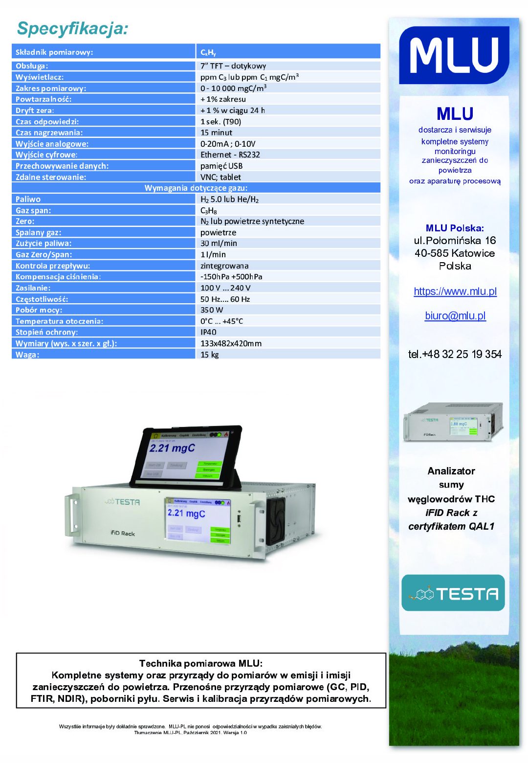 iFID Rack to stacjonarny analizator do montażu w stojaku, służący do monitoringu ciągłego całkowitej sumy węglowodorów (THC, z detektorem płomieniowo-jonizacyjnym FID. Posiada on certyfikację zgodną z EN 15267-4 QAL 1 i MCERTS. Detektor płomieniowo-jonizacyjny (FID) analizatora stacjonarnego iFID Rack wykonuje pomiary stężenia sumy węglowodorów podczas emisji z kominów, ponadto może służyć do sterowania procesowego, a także do pomiaru LZO. Cała ścieżka gazowa jest podgrzewana do 300°C, w związku z powyższym można mówić o pomiarach wysokotemperaturowych FID.